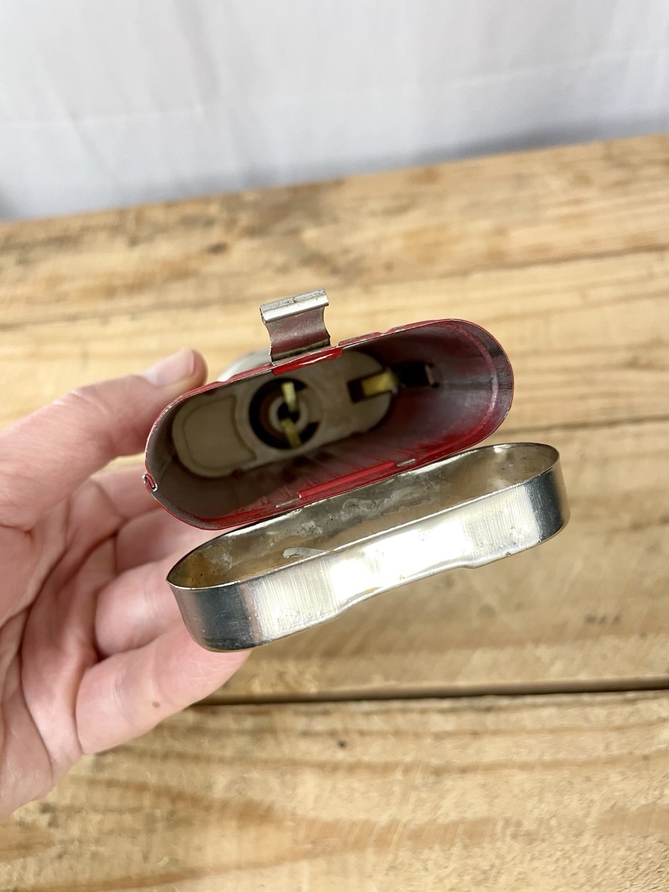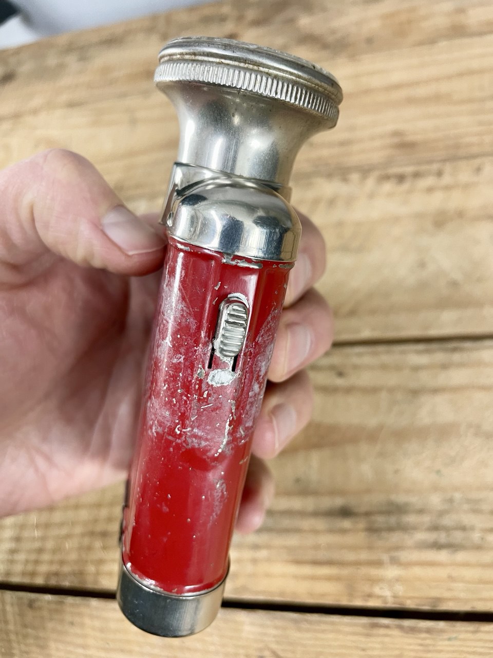 Nyt tarjolla hellyyttävä punainen taskulamppu DDR:n haudasta! Lampussa polttimo ja ON/OFF-kytkin. Se toimii isolla 4.5V 3R12 paristolla. Ja kuulkaa nyt - siis TOIMII, tämä on täysin ehjä. Yksittäiskappale!