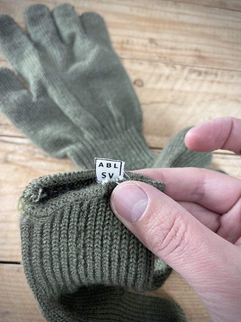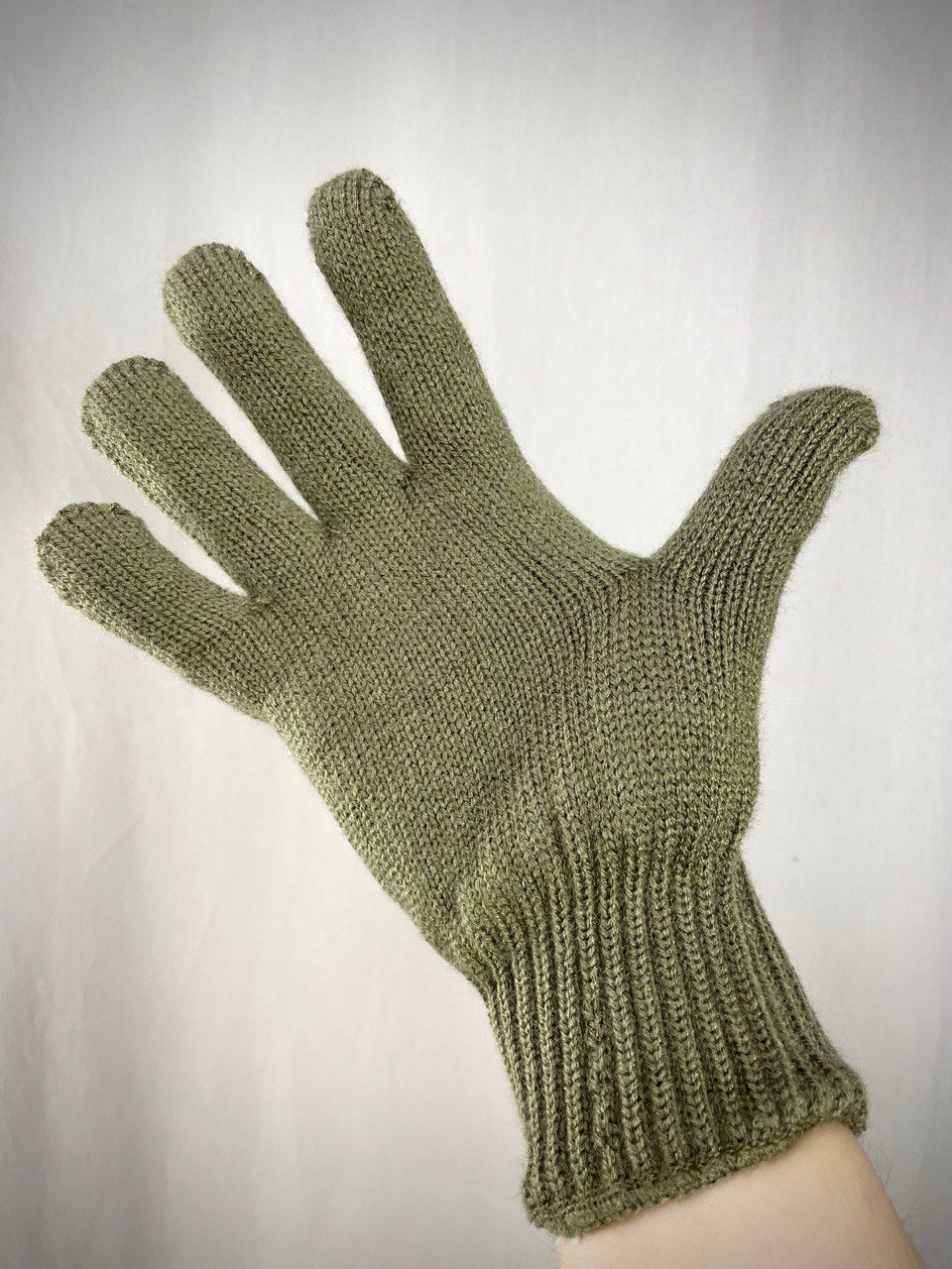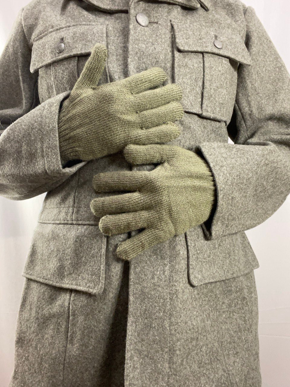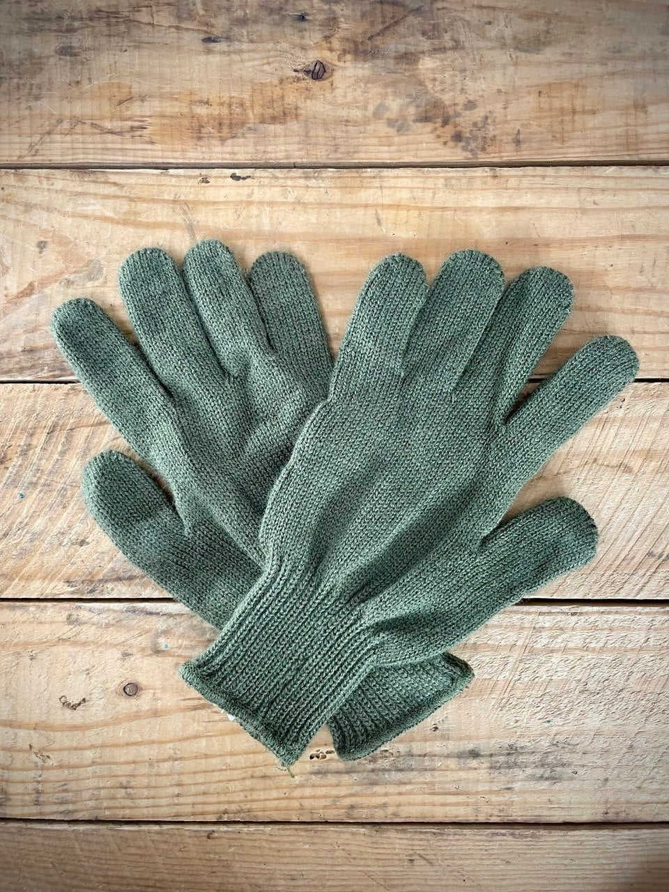 Aivan tavalliset viidellä sormella varustetut neulesormikkaat, jotka ovat varmaankin suurimmaksi osaksi villaa. Tosi kestävä neulos, jämpti jousto ranteessa. Käyttämättömiä, mutta varastoitu pitkään. Aitoa armeijaylijäämää.