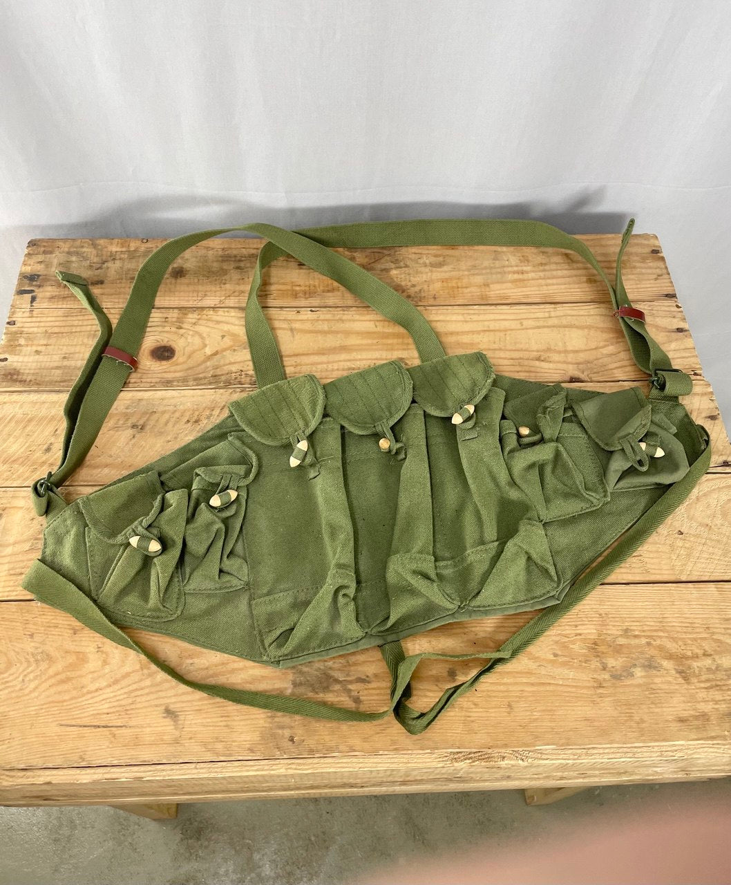 Perinteinen ja paras kantolaite Kalashnikovin lippaille, vaikkei oliskaan. Tuttu jo Vietnamin sodasta. Tähän kun laittais muoviset pikaklipsit hihnoihin ja velcroa lipastaskujen sulkuun niin johan olis nopee, mutta on se komia näinkin.