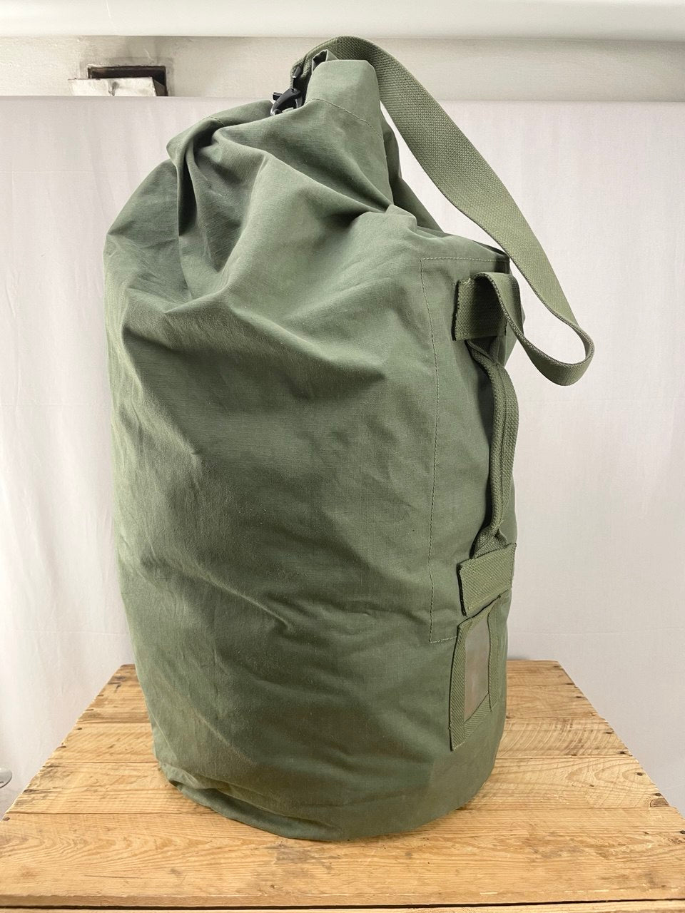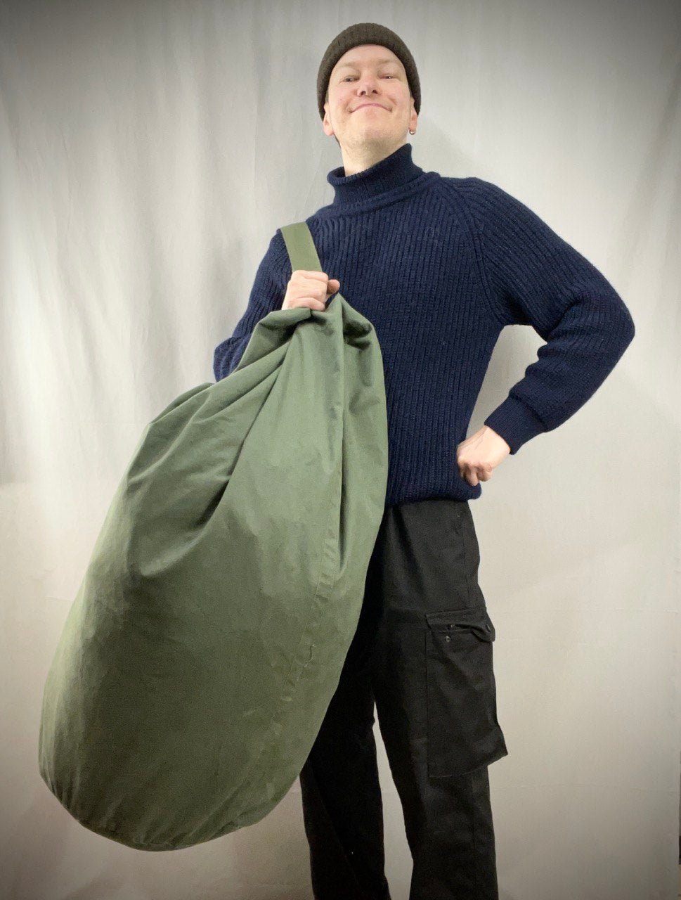 Oikein perinteinen merimiessäkki Hollannin armeijan tai merivoimien ylijäämänä. Vastaa kooltaan isoa jätesäkkiä ja on kerrassaan mahtava ja kapine isomman tavaramäärän huolettomaan roudaamiseen tai säilyttämiseen. Käytettyä armeijaylijäämää.