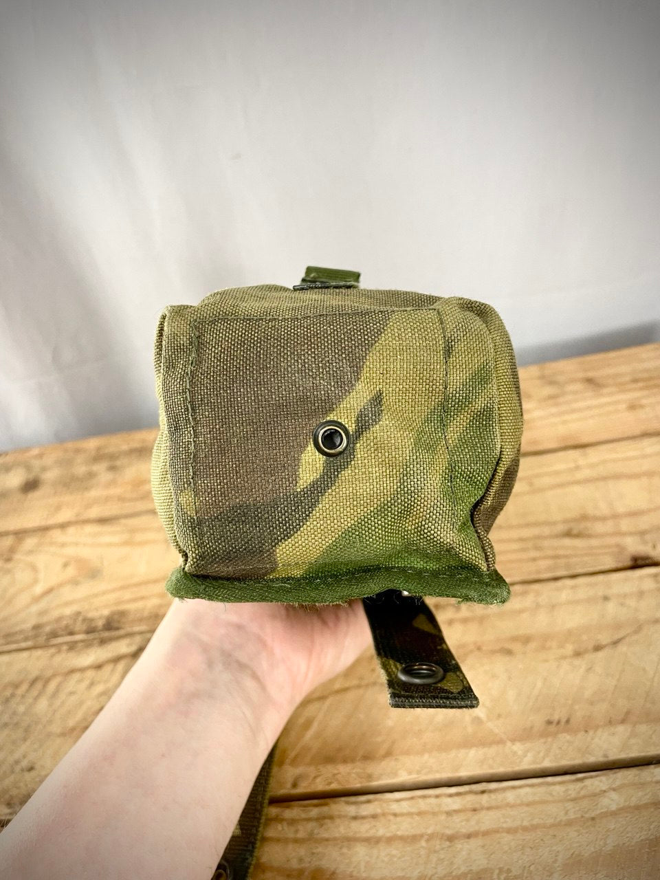 Käytettyjä, mutta ehjiä ja käyttökelpoisia tarkoitukseensa. Uutena vastaavat maksavat monta kymmentä euroa, nämä käytetyt ovat hinnaltaan ihan kirppariluokkaa mutta laadultaan silti pomminvarmaa. Maastokuvion sävyt voivat vaihdella, näitä on valmistettu vissiin aika monen valmistajan toimesta. Mutta tässä taskussa maksat lähinnä funktiosta.