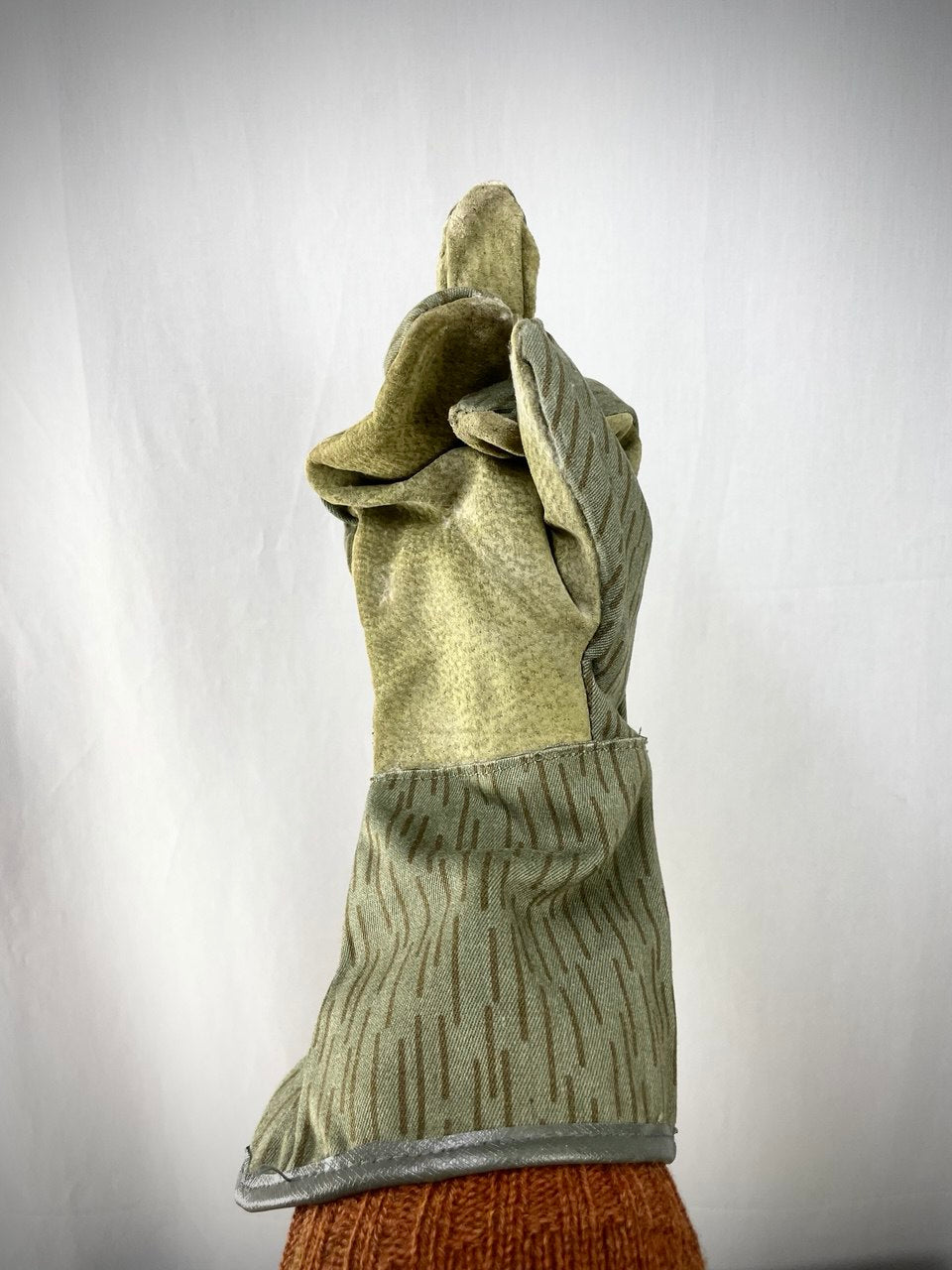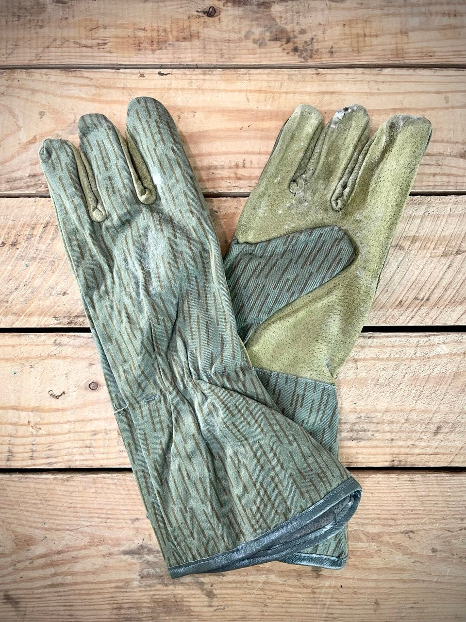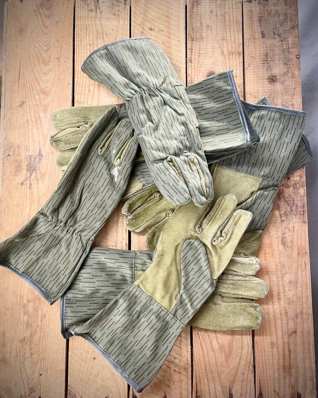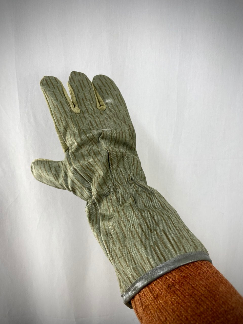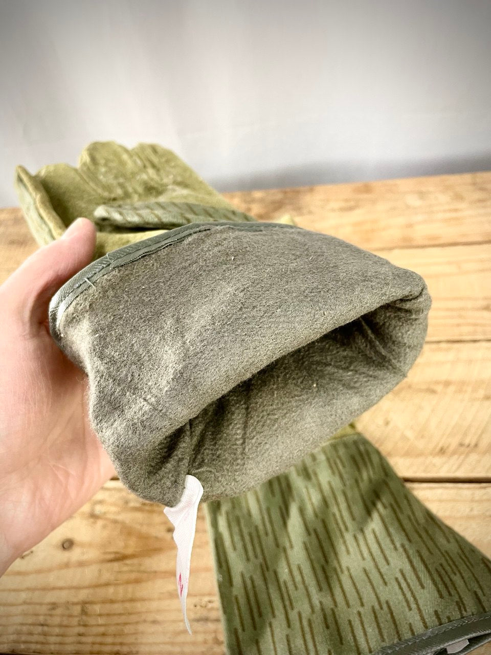 Päällikangas kansanarmeija NVA:n riveistä tuttua Strichtarn-maastokuvioitua kangasta, tämän alla jokin koppuraiseksi muuttunut pinnoite ja alimpana kevyt tekohuopavuori. Kämmenpuoli varmaan possunnahkaa. Itä-Saksassa oli ihan yleinen juttu että pikkurilli ja nimetön olivat kasvaneet yhteen, siksi näissäkin on vain yksi leveä sormi rivin lopussa.