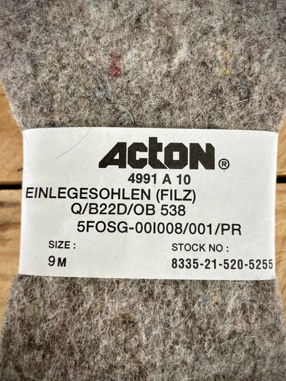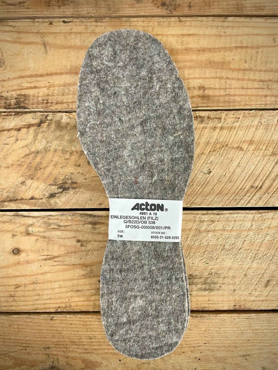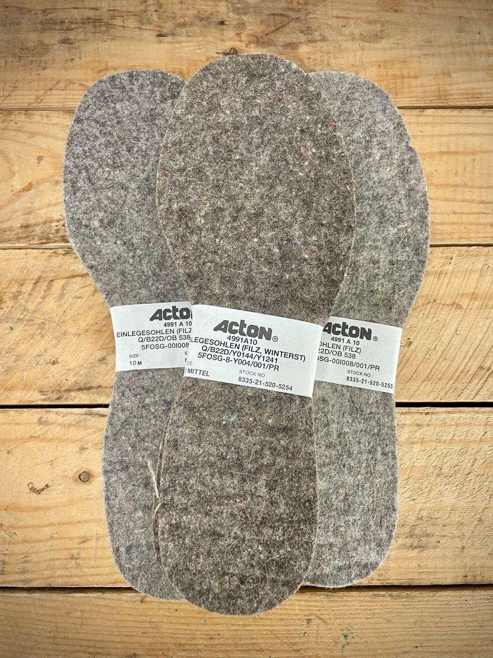 KERRANKIN ihan oikeat huopapohjalliset, eikä mitkään pilipali-nirunarulirpakkeet, niin paksuuden kuin leveydenkin puolesta. Nämä ovat tarkoitettu Mukluk-lumibootsien kanssa käytettäviksi ja ne passaavat kaikkiin tilaviin talvikenkiin - tarvittaessa vähän leikkelemällä saksilla muotoon. Valmistettu jostain hyvälaatuisen oloisesta villasta, tai villan ja keinovillan sekoituksesta, joka tapauksessa törkeän lämpimät. Valmistaja Acton, joka on kova tekijä kenkäpuolella.