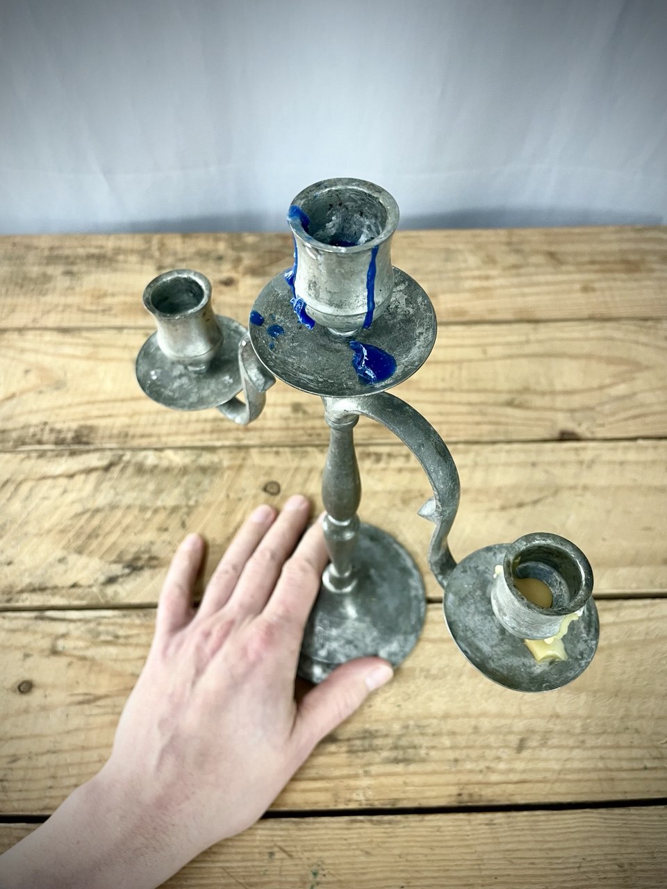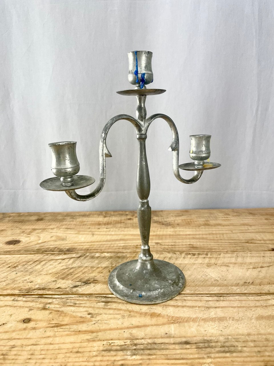 Kaikki kynttelikköintoilijat huomio! Nyt tarjolla painava, metallinen kolme antiikkikynttilää vetävä kynttelikkö, semmoinen joka otetaan pöydältä aina käteen kun lähdetään yöpuvussa katsomaan kuka alakerrassa hiippailee.