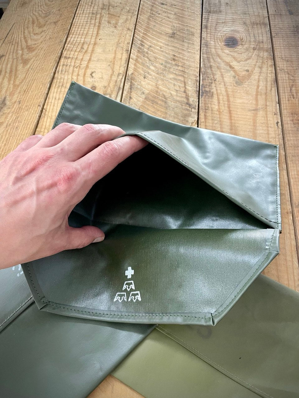 Lättänä kuminen tasku, ruotsalaista lääkintärojua. Käyttämätöntä mutta vanhaa armeijaylijäämää. Kätevä säilytysnyssäkkä papruille tai sillain vähän niinkuin säässä suojassa pidettäville pikkukilkkeille.