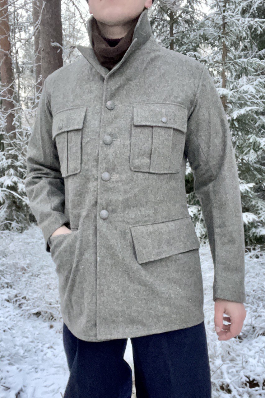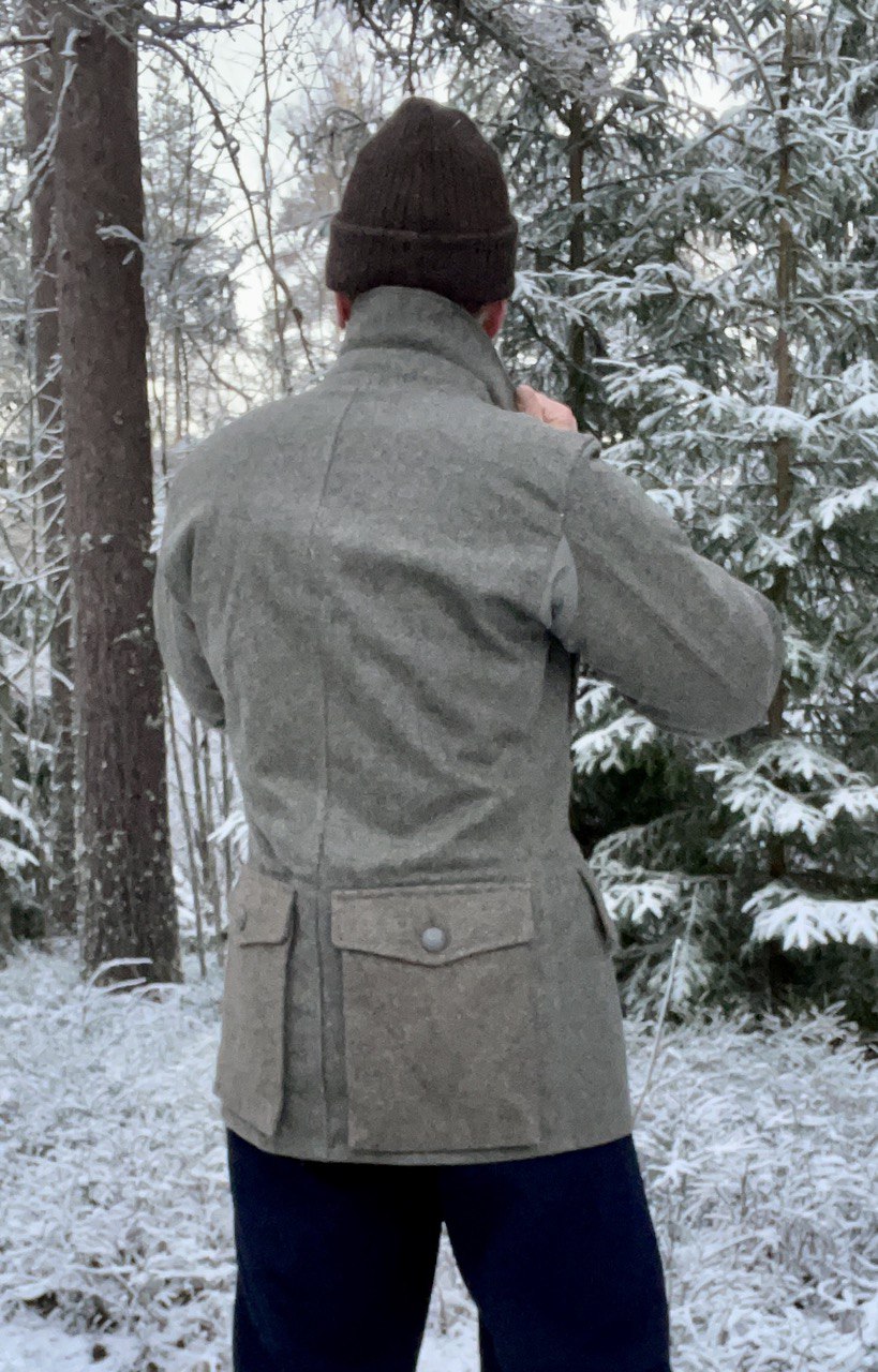 Takki on perinteinen uniformutakki, mutta tehty sellaiseksi, että sen kanssa pystyy rymyämään metsässä - kuten sotilasvaatteen kanssa kuuluukin tehdä. Tästä on iloa myös arkielämässä ja tietenkin retkeilyssä. Se suljetaan erittäin miellyttävästi toimivalla nappisululla ja siitä löytyy liuta taskuja niin ulkoota kuin sisältäkin. Takin erikoisuutena ovat takapuolen helmataskut, jotka ovat sotilaskäytössä huomattavan käytännölliset, mutta jos ne eivät ole tarpeelliset, voi ne ratkoa helposti pois; ne ovat ommeltu takkeihin jälkikäteen, kun Ruotsissa sota-ajan sarkavaatteita muokattiin "modernimmiksi".