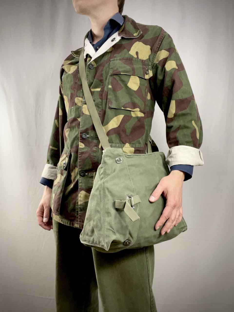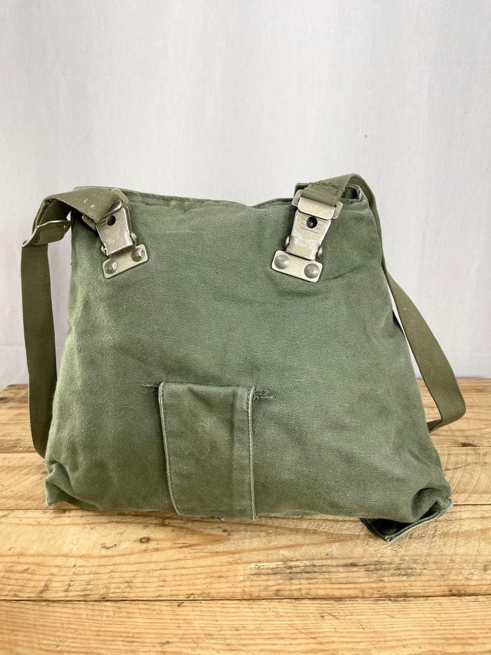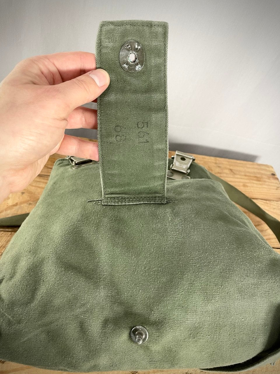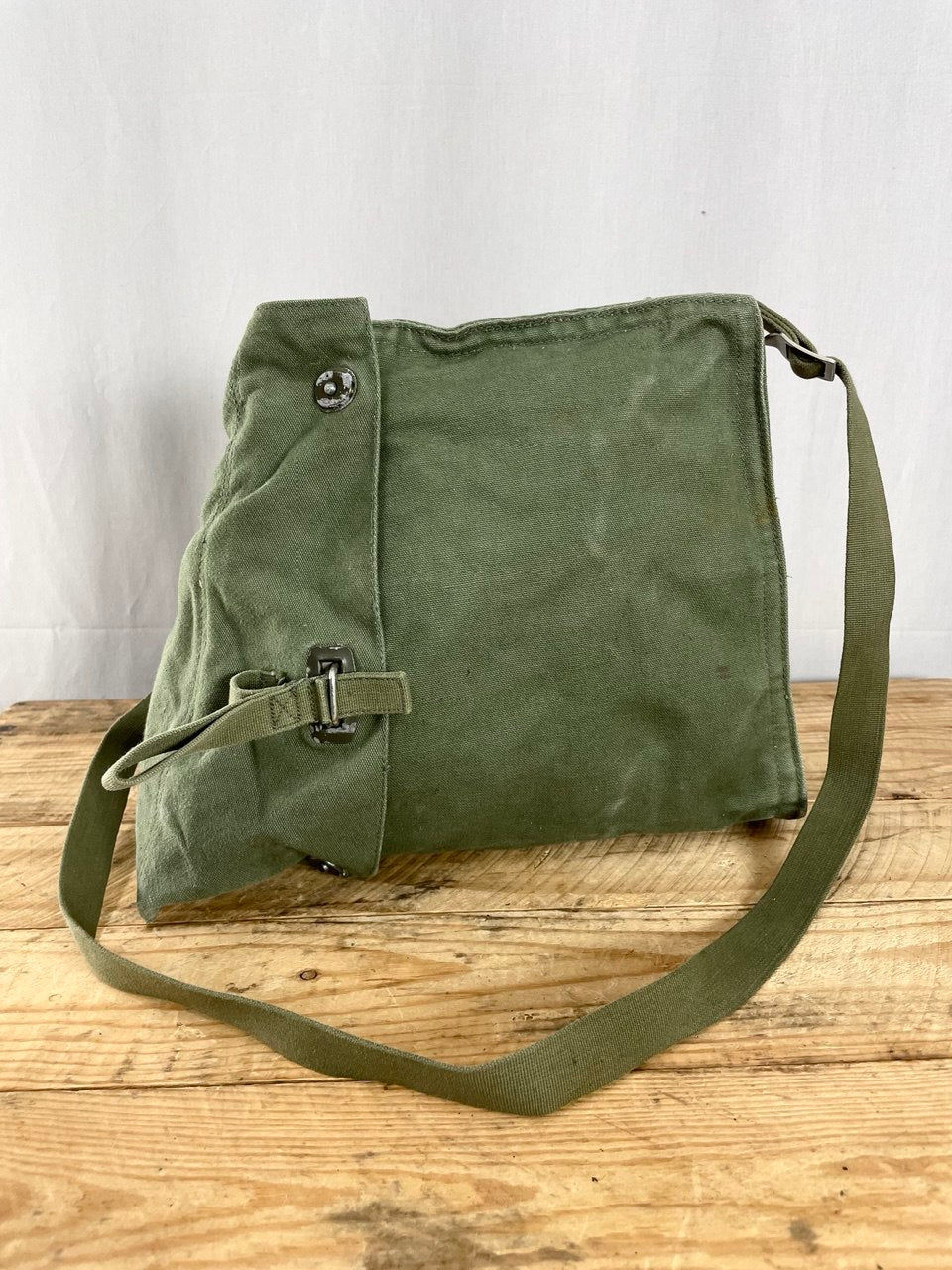 Käytettyä, mutta ehjää armeijaylijäämää. Varastoitu tosi pitkään eikä missään tyhjiössä, joten metalliosissa voi olla kalkkeutumaa ja puuvillakankaassa jonkinlainen vanhan varaston aromi. Kaikki tuoksut lähtevät kyllä pois kun laukkua vaan käytetään.