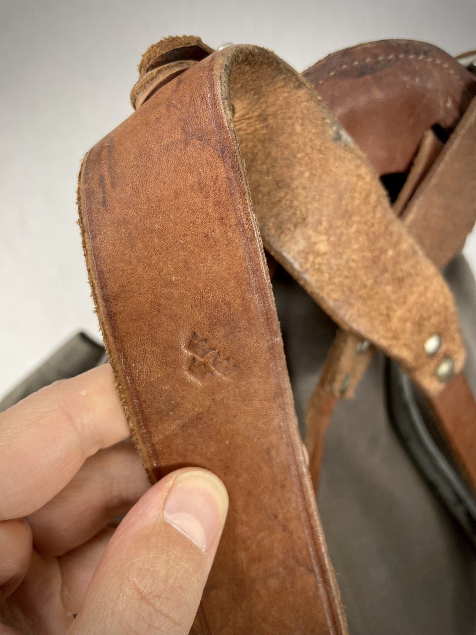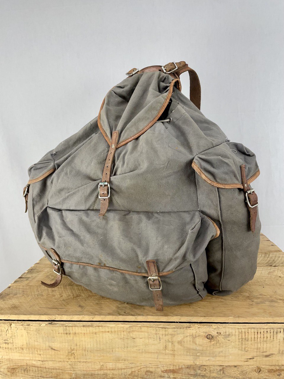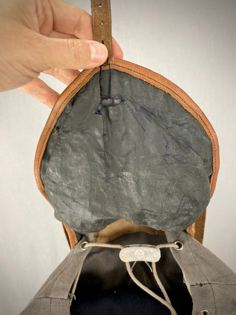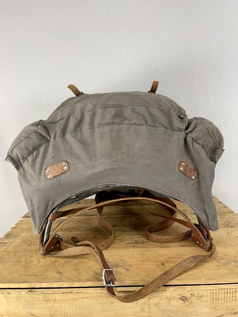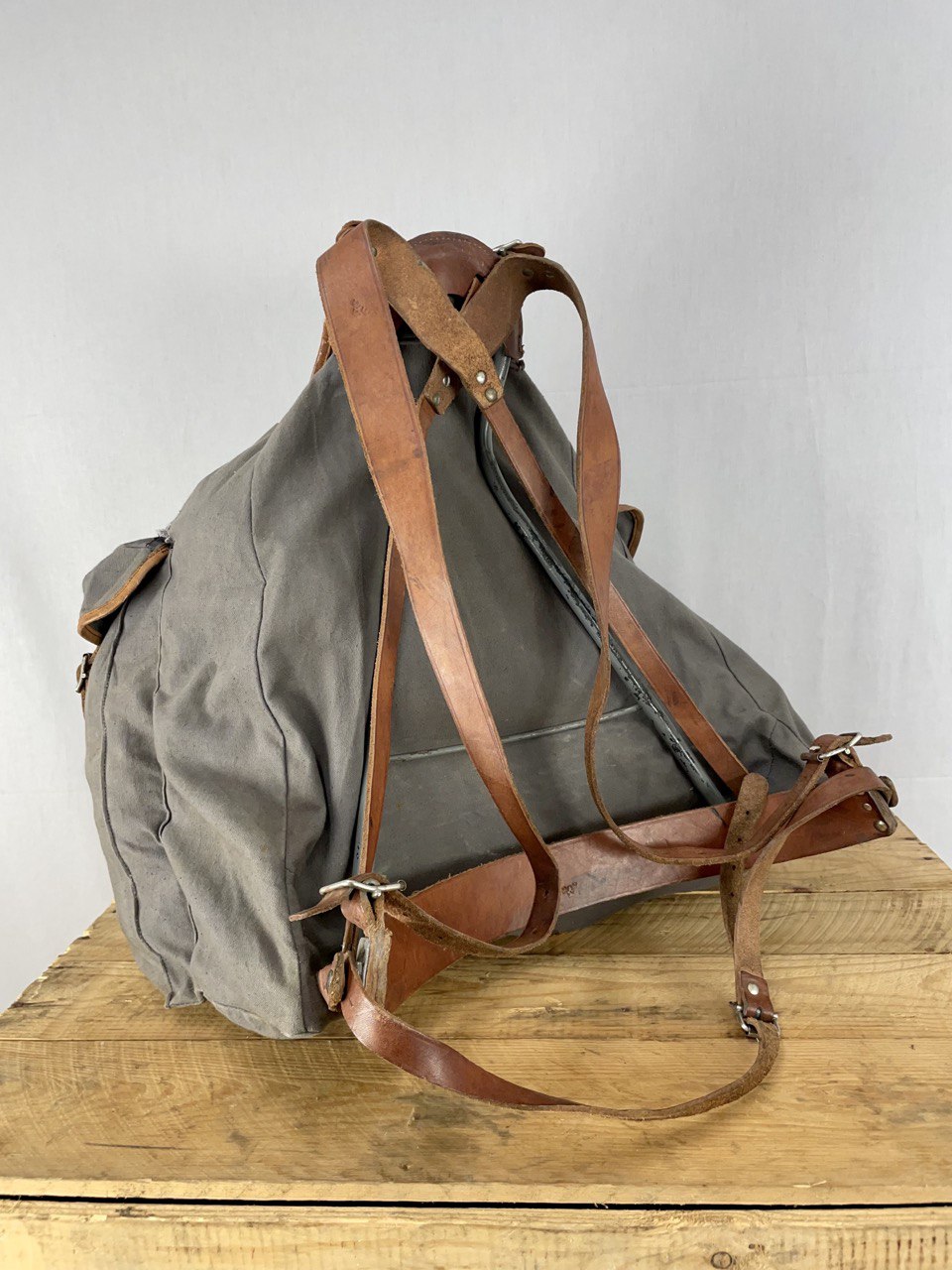 Reppu on ikäisekseen erittäin kauniissa kunnossa, uskaltaisin jopa myydä tätä käyttöön, kunhan muistat rasvata nahkaosat. Toisen sivutaskun läpän yläreunassa on pieni reikä, joka kantsii varmaan paikata. Muuta varsinaista vikaa tässä ei ole. Helvetin hieno länsinaapurin reliikki.