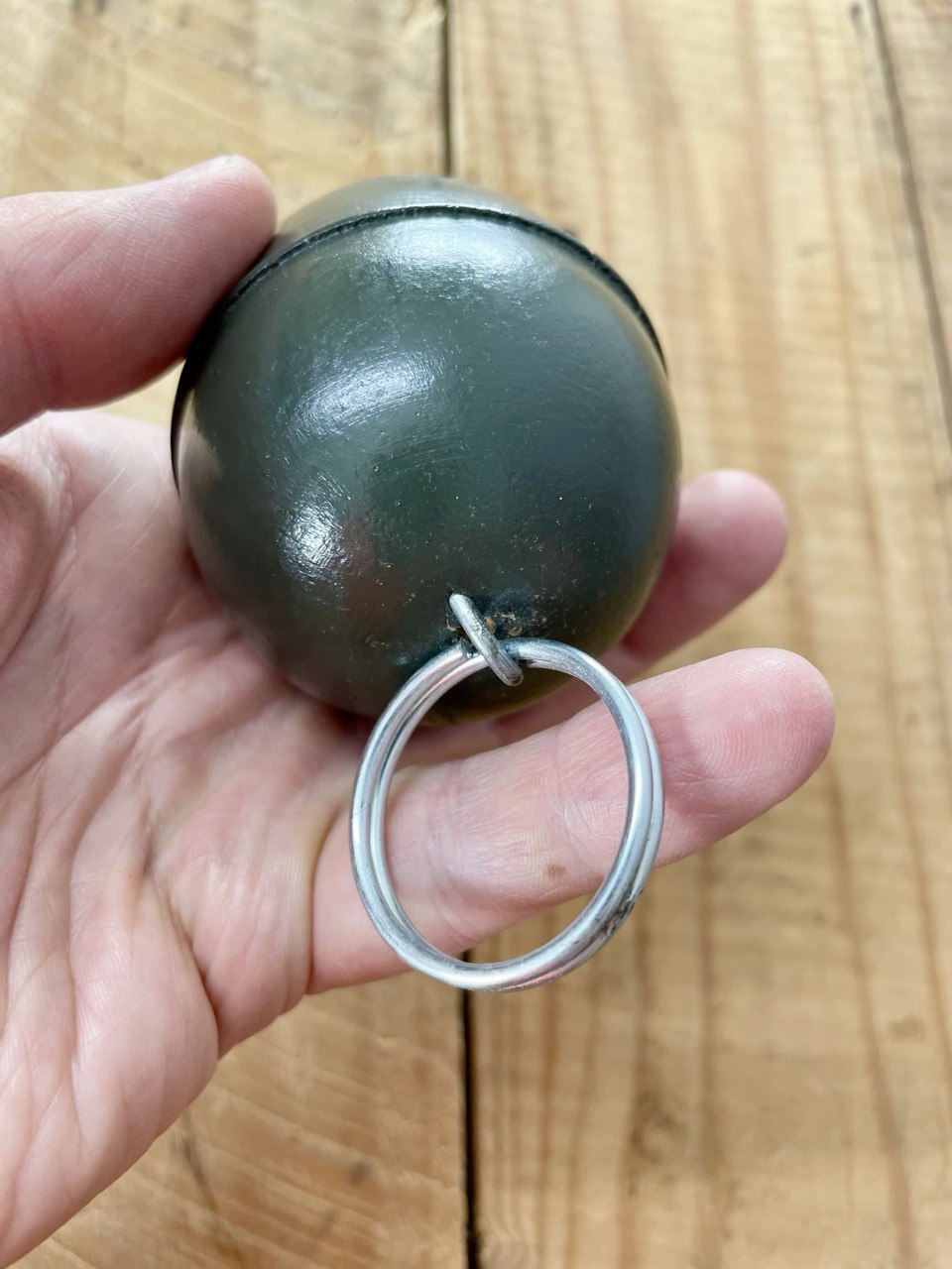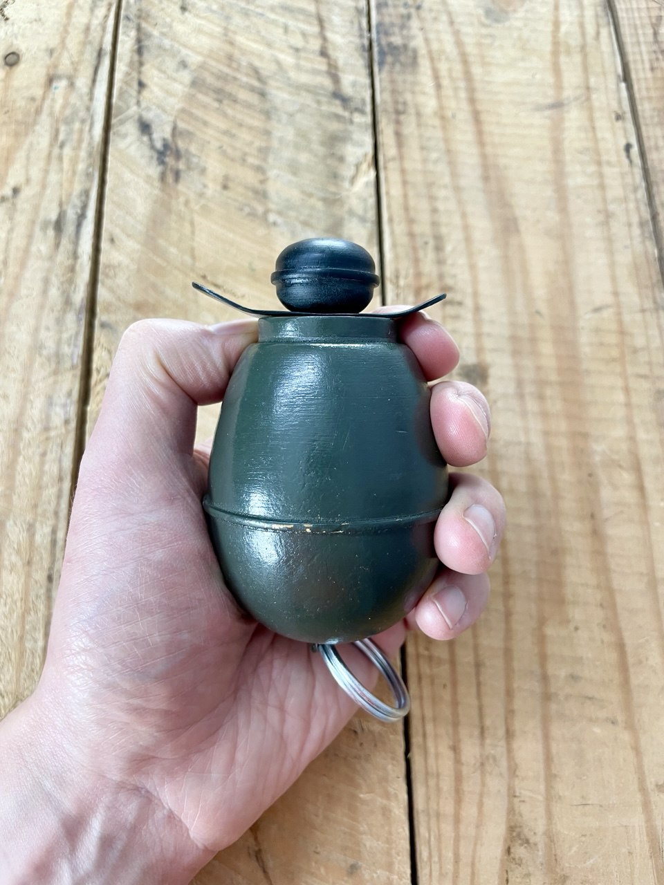 Saksalainen sota-aikainen munakäsikranaatti, jonka pohjassa kätevä roikotuslenkki. Tämä on paitsi re-enactmentiin soveltuva, myös hieno avaimenperä vaikka vessan avaimeen. En tiedä. Osta pois.
