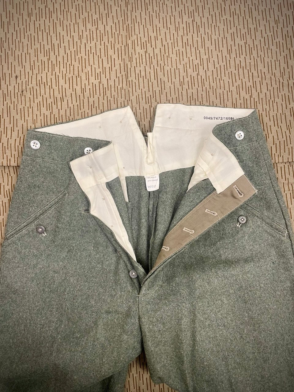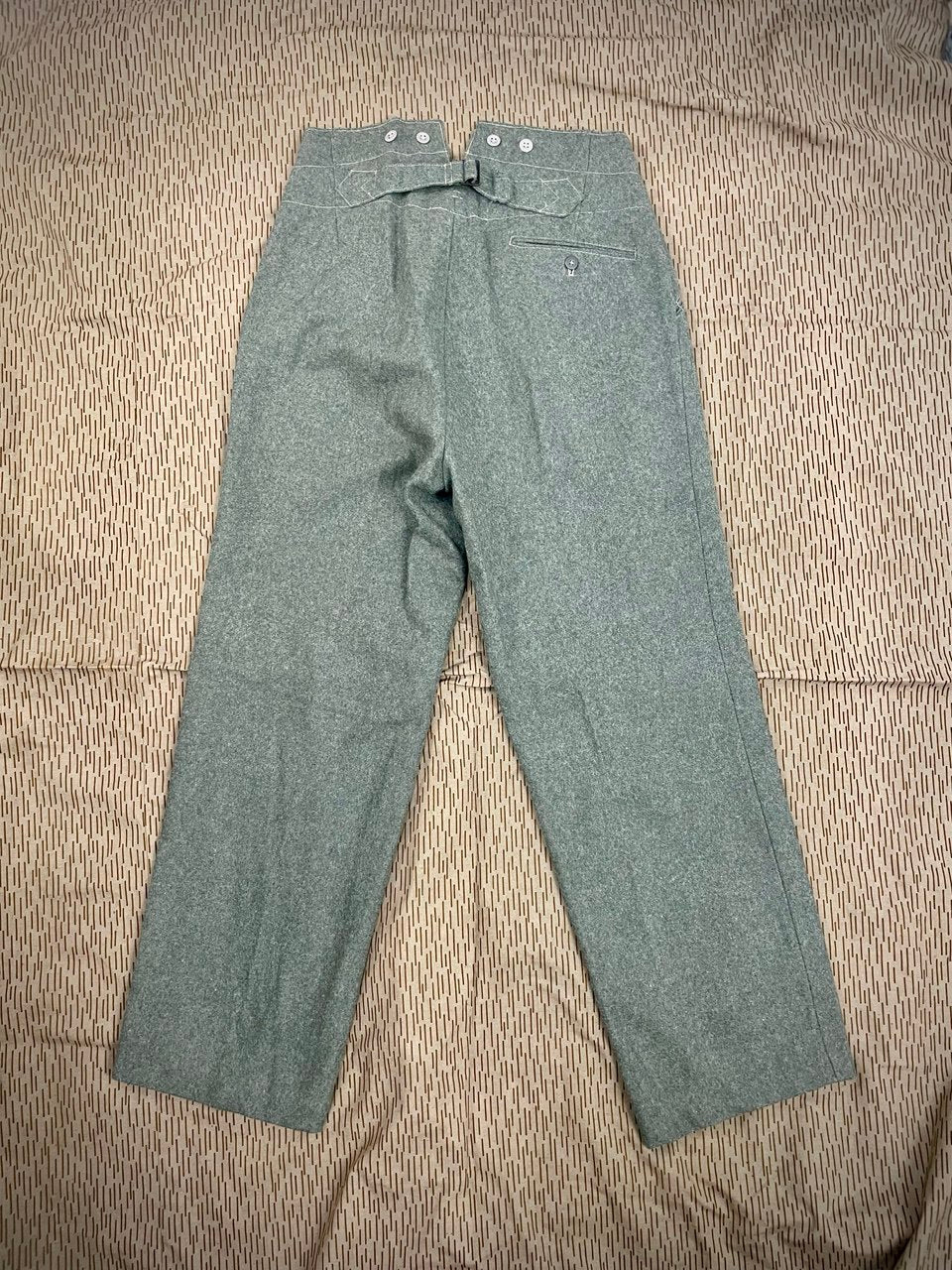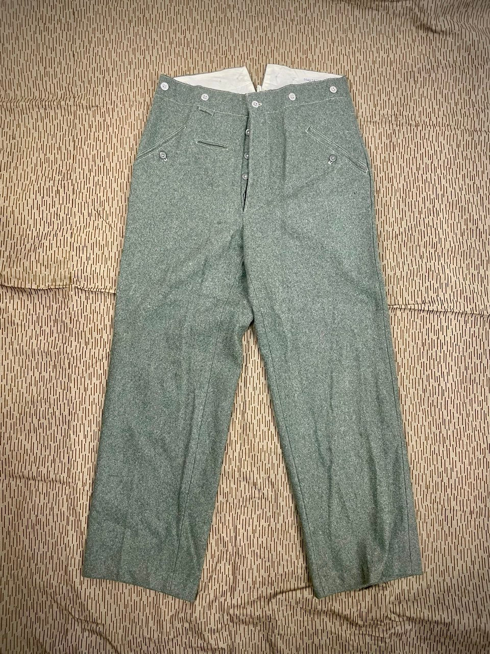 Hyvin perinteiset suoralahkeiset sarkahousut. Uusiotuotantoa sota-aikaisista saksalaisista. Valmistaja Sturm, nämä ovat vissiin ehkä vähän aikaisempaa (= laadukkaampaa) tuotantoa. Jostain tämmöisetkin löytyi, ostakaahan pois kun tuo talvikin tuolta tulee jne.