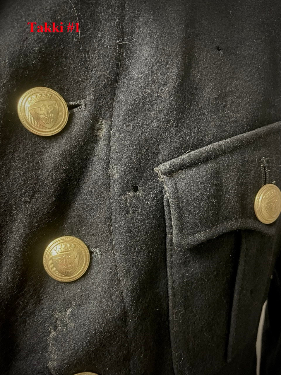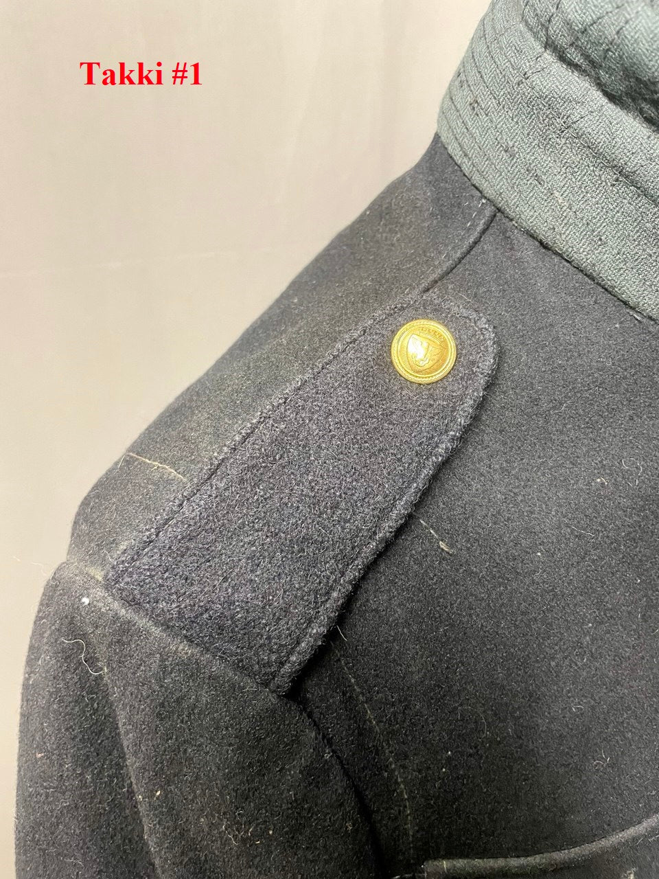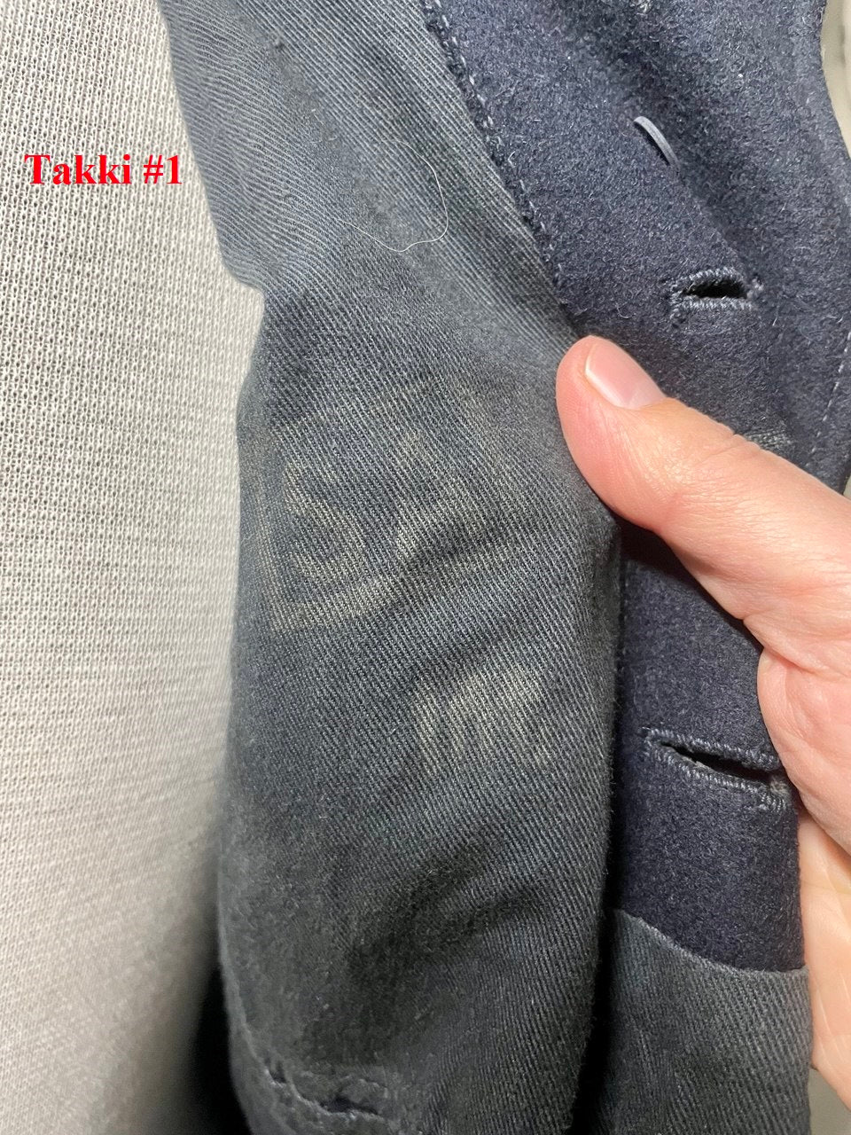 Takki #1: Hyvässä peruskunnossa, ottaen huomioon yli 80 vuoden iän. Ainoa selkeä puute on hukkunut ensisidetaskun nappi ja hihansuiden halkioiden puuttuvat napit (halkiot ommeltu käsin kiinni), muuten kaikki on tallella. Takissa on pieniä koinsyömiä (siis oikeasti pieniä, nuppineulan pään kokoisia) ja normaalia kulumaa siellä täällä. Joku pölö on kirjoittanut tussilla EU-koon haalean Wehrmachtin kokoleiman päälle.