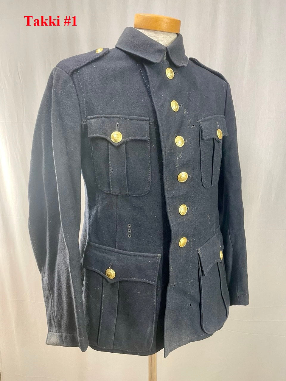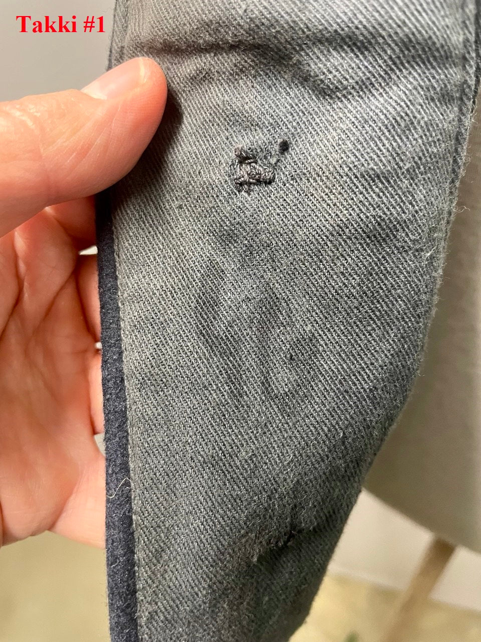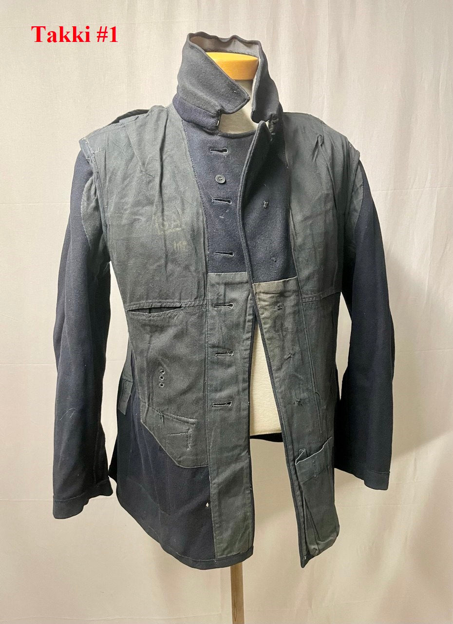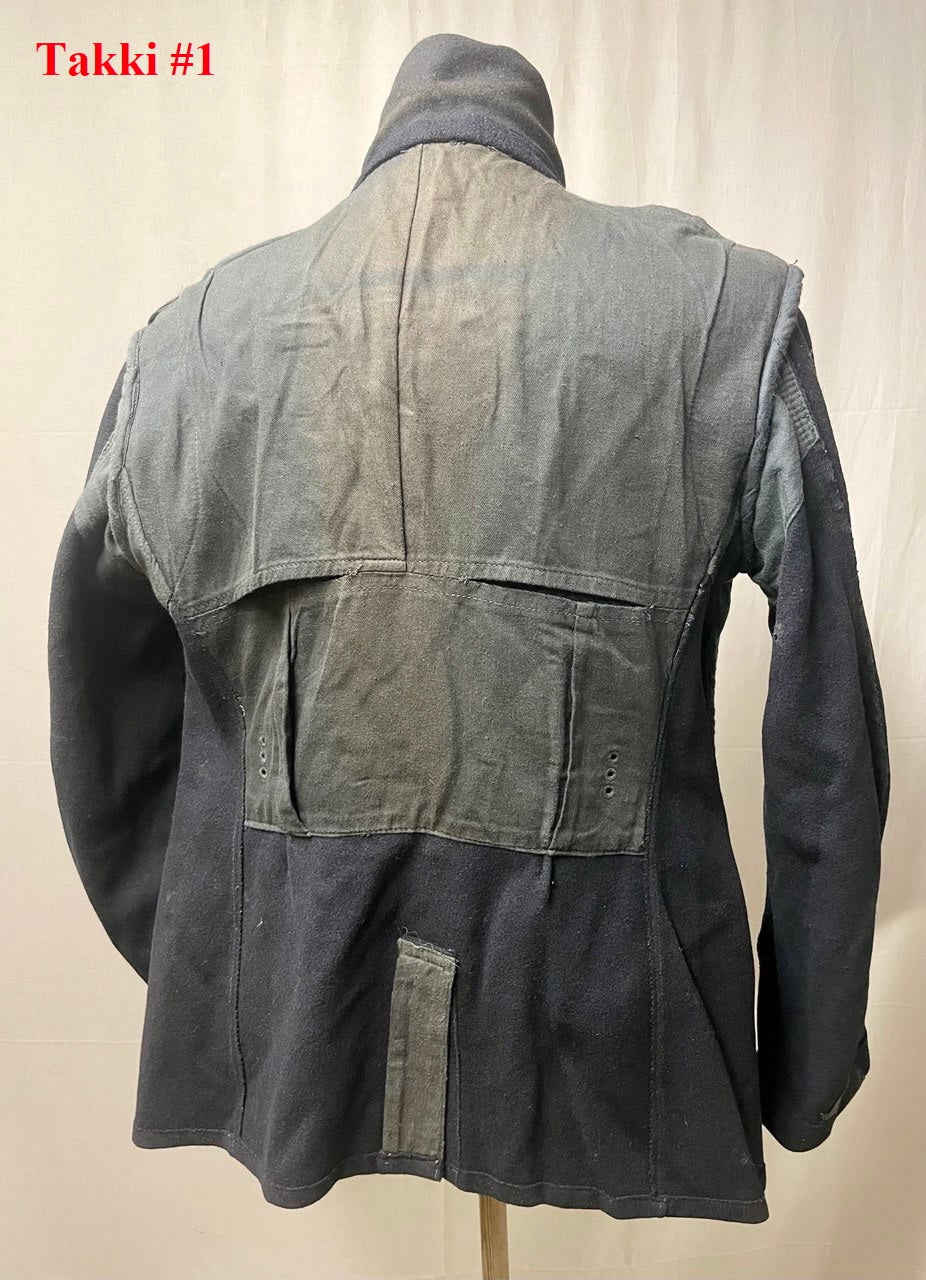 Takki #1: Hyvässä peruskunnossa, ottaen huomioon yli 80 vuoden iän. Ainoa selkeä puute on hukkunut ensisidetaskun nappi ja hihansuiden halkioiden puuttuvat napit (halkiot ommeltu käsin kiinni), muuten kaikki on tallella. Takissa on pieniä koinsyömiä (siis oikeasti pieniä, nuppineulan pään kokoisia) ja normaalia kulumaa siellä täällä. Joku pölö on kirjoittanut tussilla EU-koon haalean Wehrmachtin kokoleiman päälle.