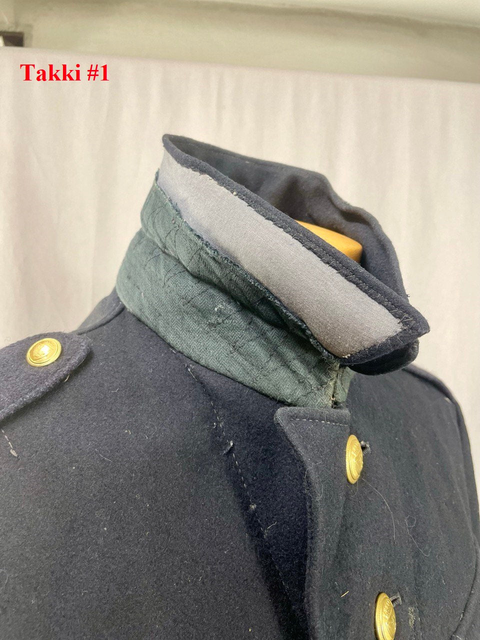 Erittäin tummansininen, saksalainen "M36"-mallin sarkatakki, Wehrmachtin anaalitarkat kokoleimat ja kaikki. Vaan nämä ovat tilattu Suomeen sillä niistä löytyvät myös SA-leimat, ken tietää miksi nämä on hommattu juuri Saksasta, miksi ei täällä tehty moisia itse. Ehkä tumma sarkakangas oli lopussa?
