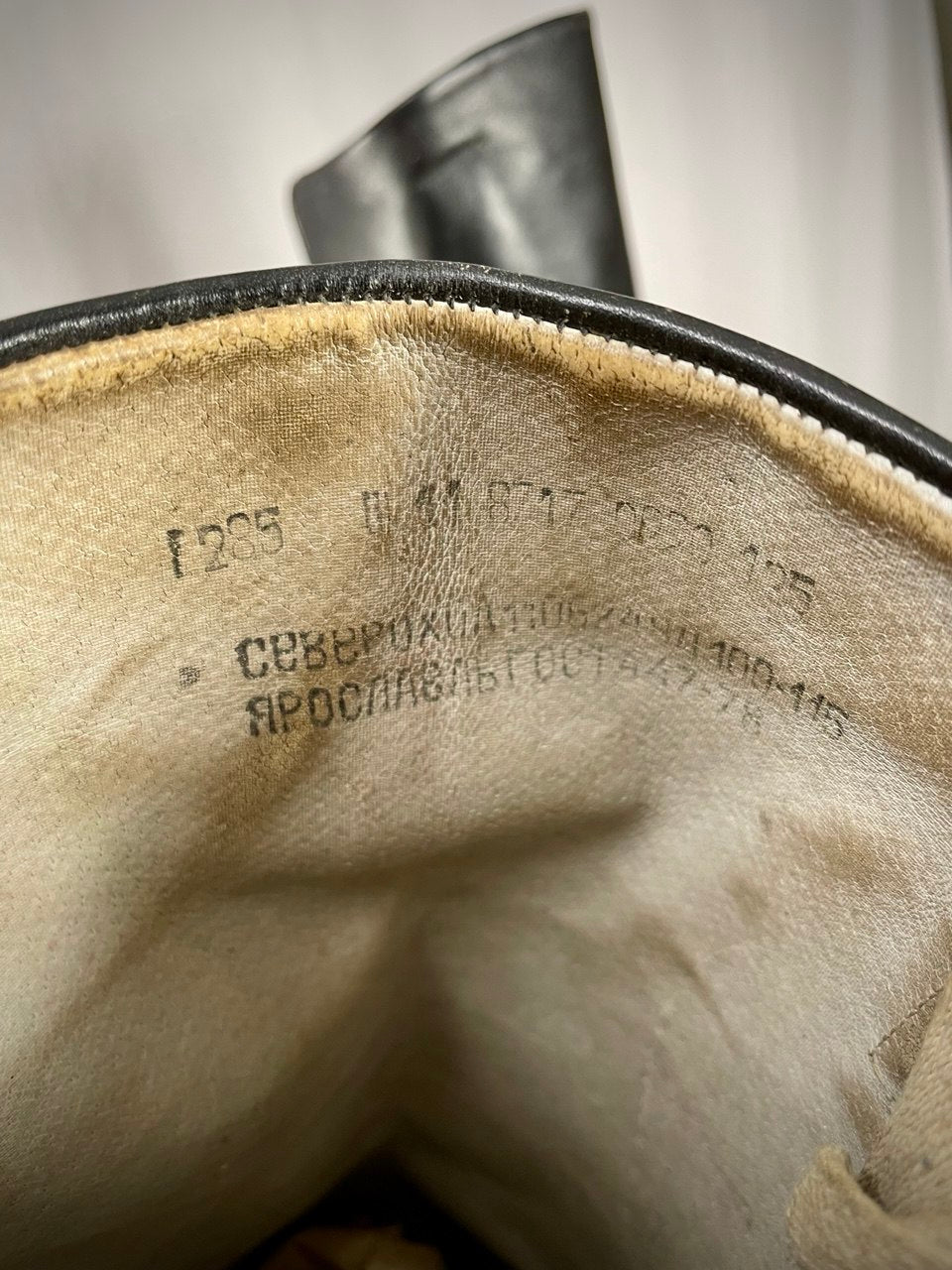 Perkaleen korkeavartiset ja pramiat saappaat. Neuvostoliittolaiset, naulatuilla nahkapohjilla joiden päälle liimattu kumiset kulutuspinnat. Ovat olleet Suomessa (siviili-) käytössä. Harvinainen koko 44, vieläpä leveällä lestillä.