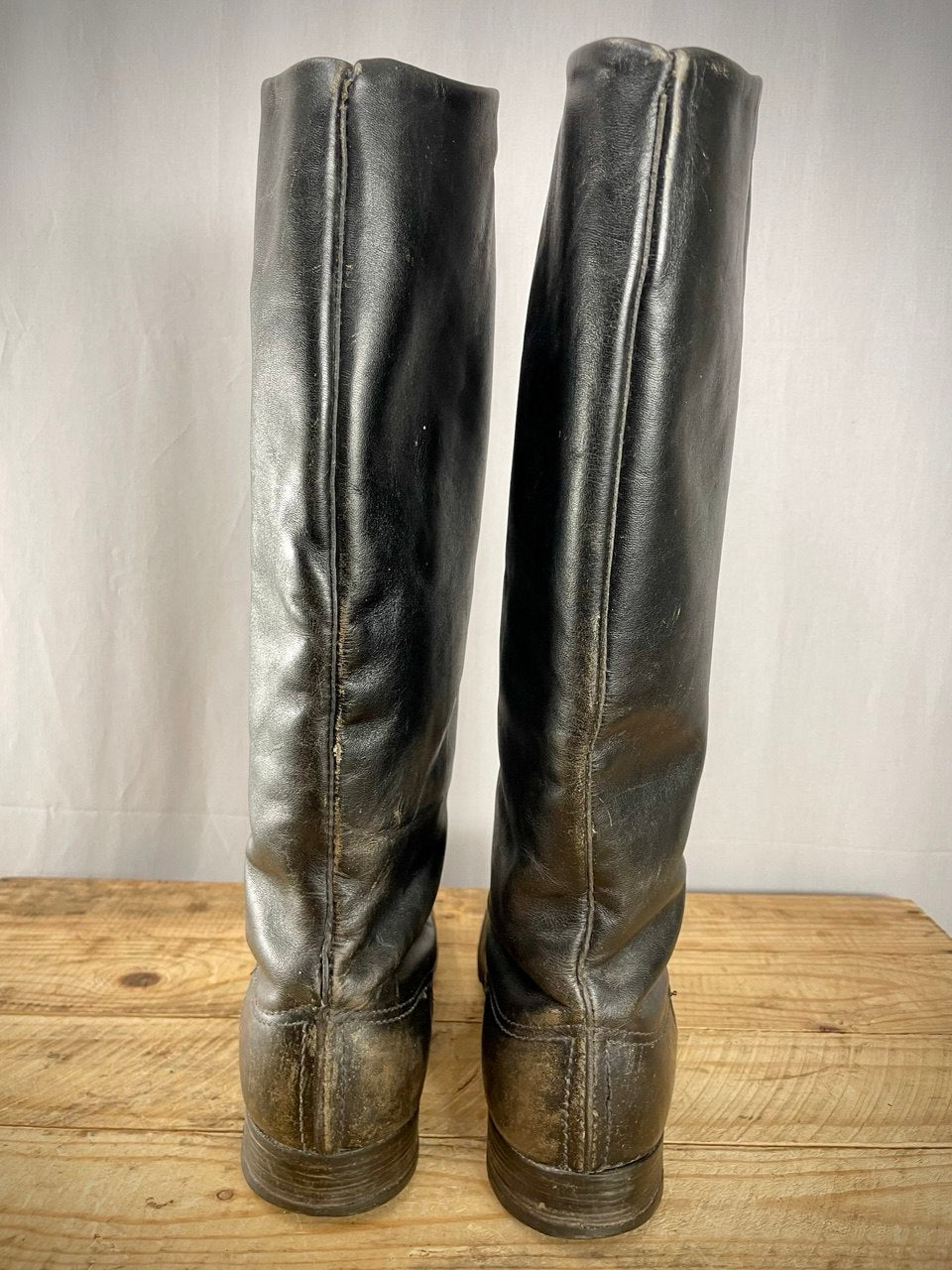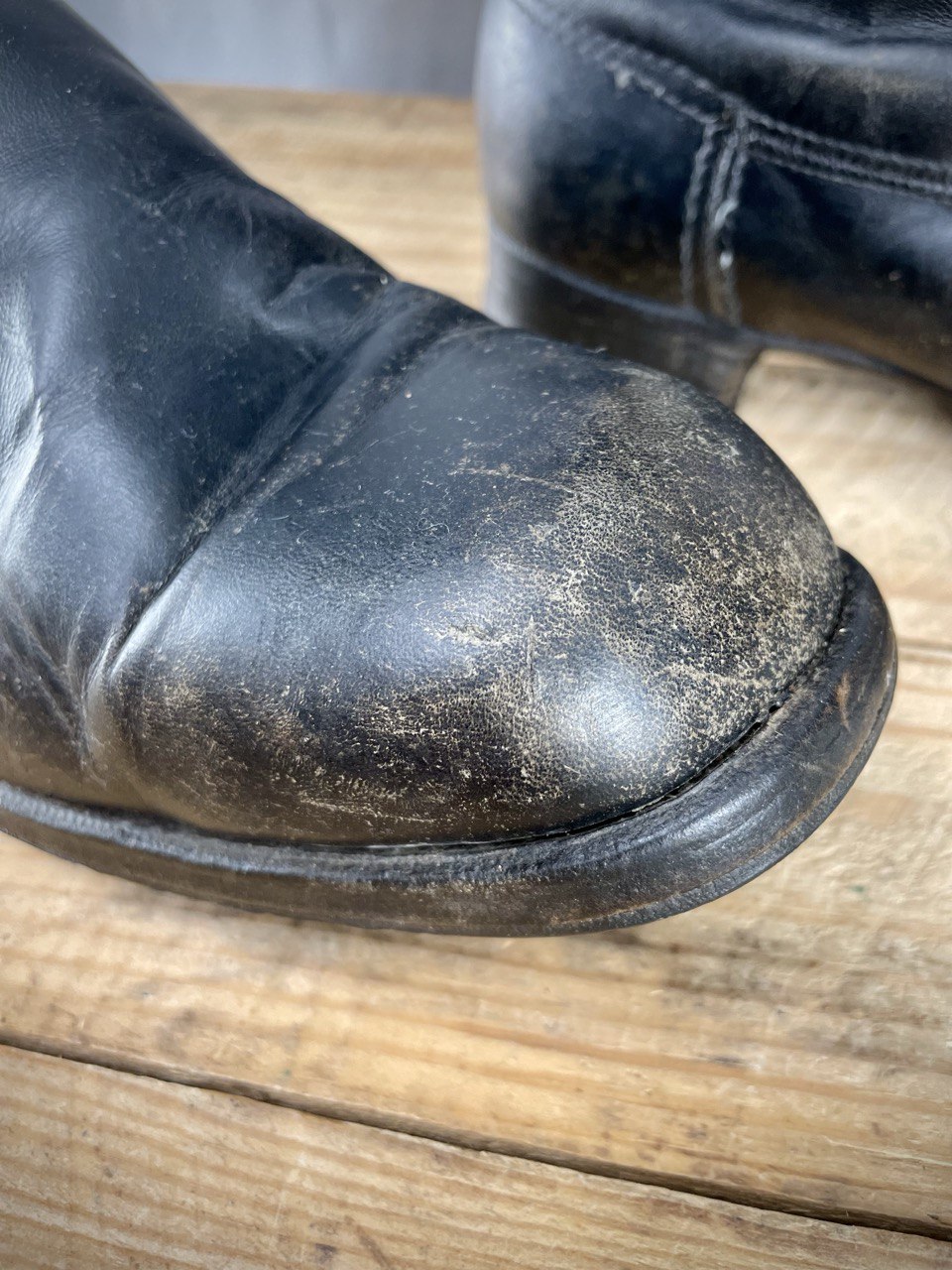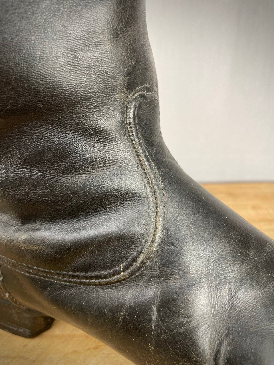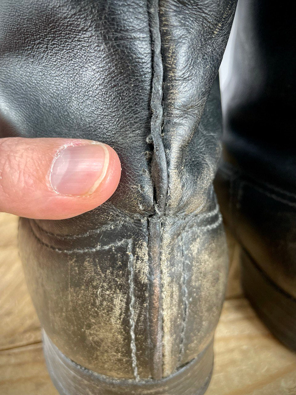 Huollettu rasvaamalla, kunnoltaan käytetyt mutta ehjät. Vasemman saappaan kantapään yltä ompeleet ovat vähän auenneet (kts. kuva), tämä on helppo ja halpa korjauttaa suutarilla. Ei missään nimessä kannata tämän takia jättää ostamatta, sillä näitä ei enää saa perkele mistään, etenkään tämmöisissä koissa.