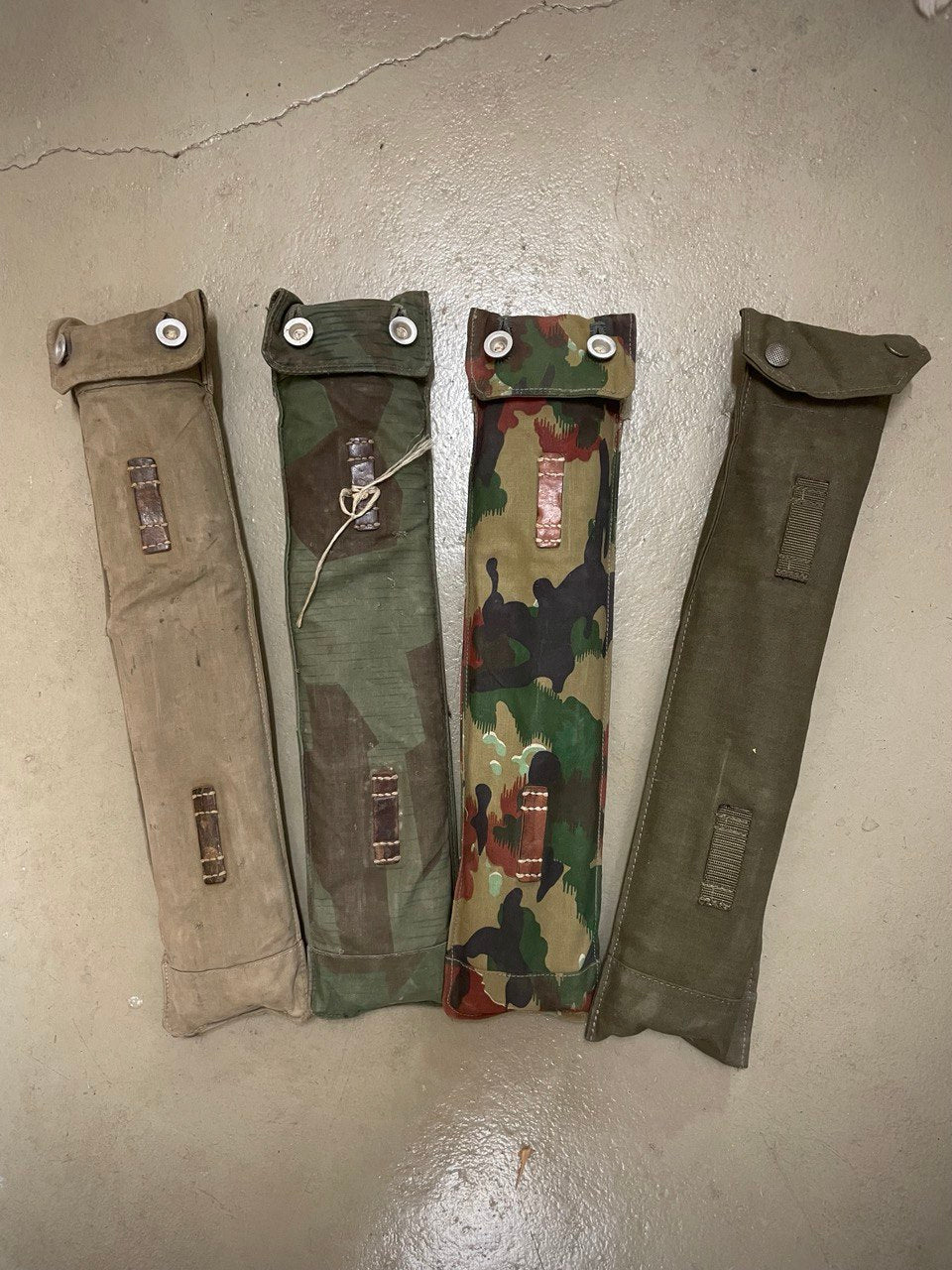 Joo, minä lajittelin nämä mallin mukaan. Kivenharmaa vanhin, sitten Splintertarn (nämä kaksi sota-ajan mallia), sitten tulee "menkkacamo" eli Alpenflage, ja uusin on vihreä neppareilla ja nailonisilla irtohihnakiinnikkeillä, varmaan tyyppinimellä M90. Sisältö on aina sama! Uudemmat ovat halvempia koska keräilysekoilut.